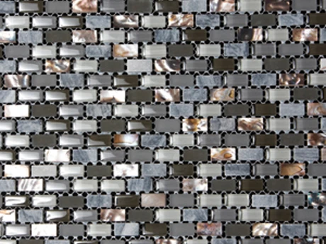 Grey glass with a glossy finish sits alongside matt stone and the iridescent surface of shell to create a melting pot of alluring textures and beautiful colours. This modern mosaic will layer an interior in rich decoration or bring a statement border into your scheme to enhance your space.