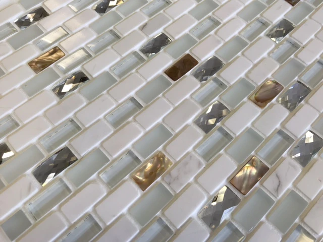 Opt for elegance with the serene beauty of the Nautica Oyster White. This tile showcases stunning materials in a modern mosaic pattern that will dress any wall in a little opulence. The petite brick bond rectangles are crafted from shimmering polished shell, natural stone, frosted glass and glittering diamond cut glass.