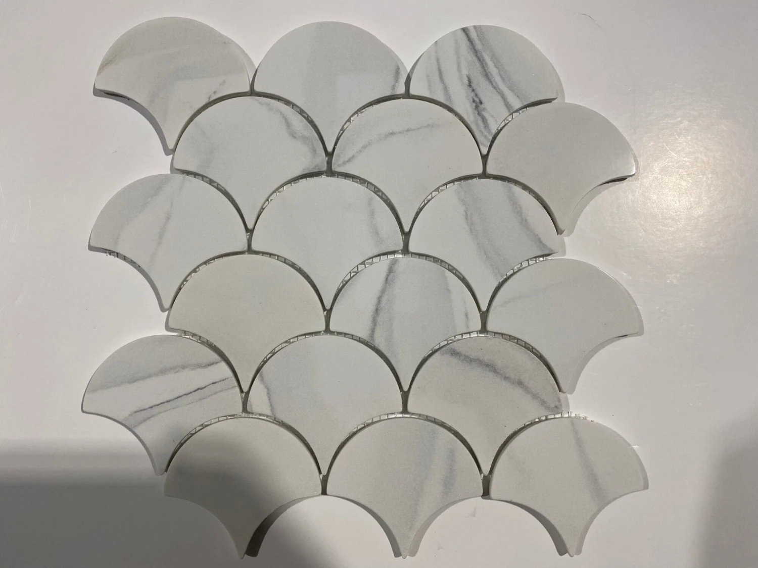 The splendid effect of the Portobello Dove Scallop is both striking and unique. Impressive and chic it leaves a lasting impression whenever it is displayed. This beautiful white and blue marbled effect mosaic is a fashionable choice for any modern bathroom, wet room or kitchen wall.