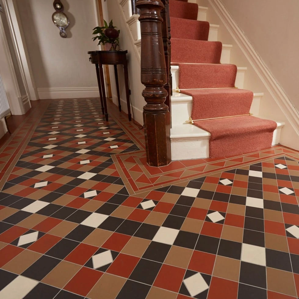 Geometric tiles in traditional colours and designs are the perfect partner to our heritage Artworks range of ceramic wall tiles, as handsomely illustrated above. Shown with a Browning border.