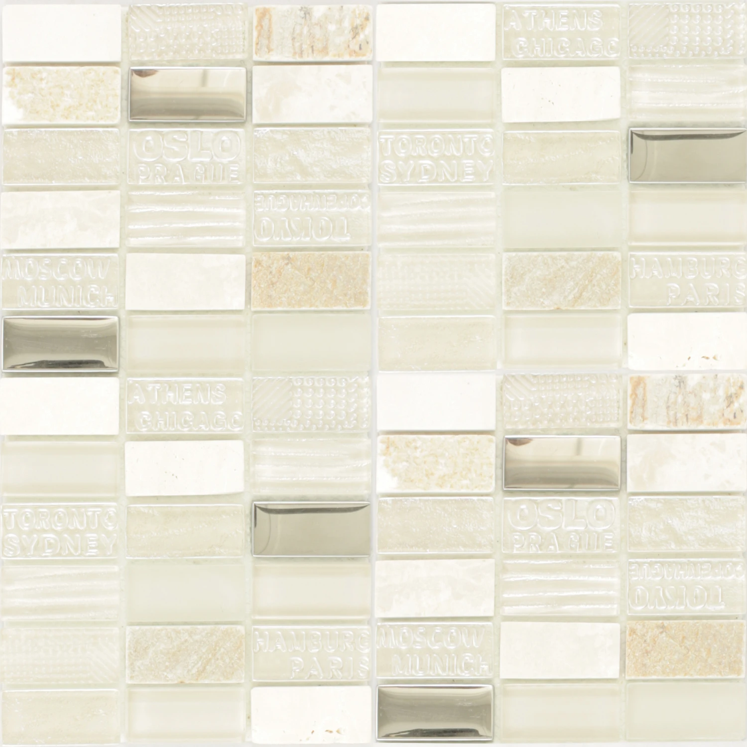 The Cities Mosaic is available in four colours. The combination of mixed materials and colours makes it very pleasing to the eye. Furthermore the imprint of city names make this mosaic truly unique.